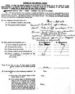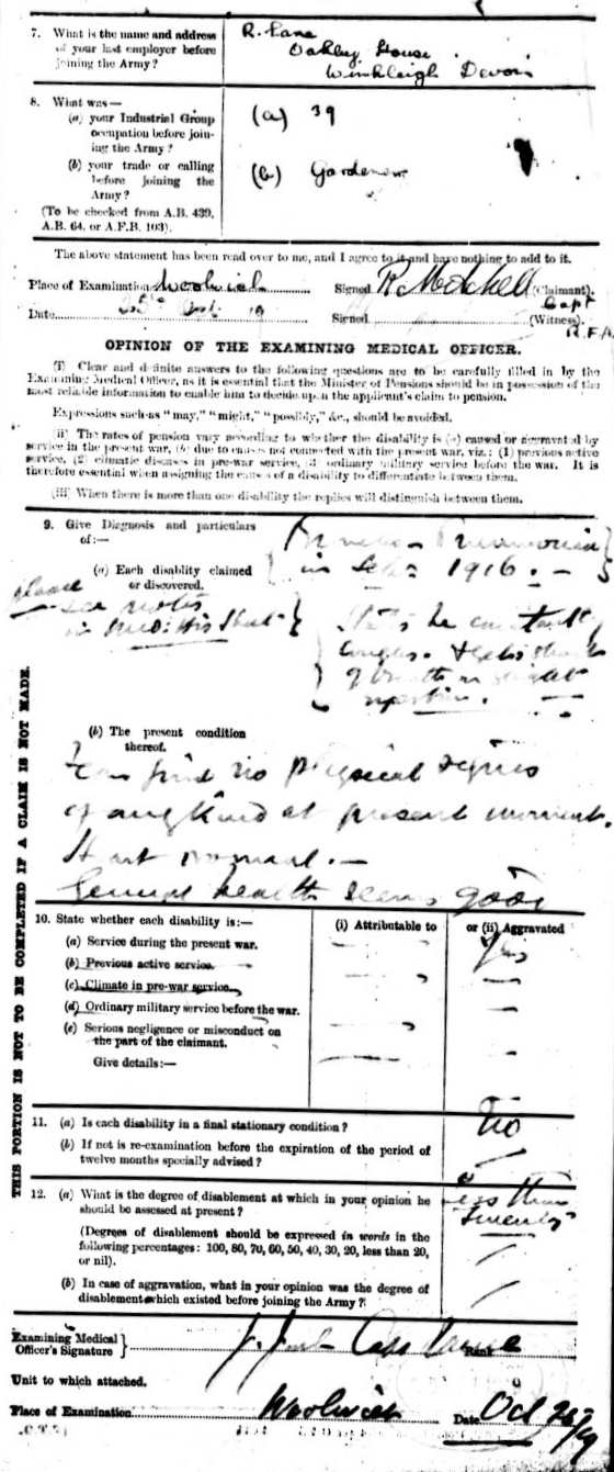 Section 6 records the statement taken on October 26th 1919 regarding the claim for disability. The claim was based on the statement ‘Septic poisoning, Bronchitis, Double pneumonia caused through vaccination and inoculation on 31st August 1916’. The opinion of the medical officer is difficult to read but it has been deciphered.