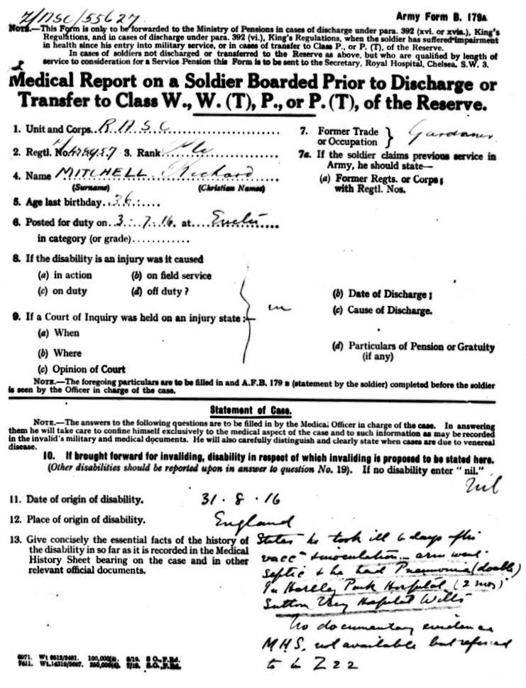 The Medical Officer seemed to consider that Richard was exaggerating his condition. After this verdict there was very little hope of a pension for Richard, and his claim was rejected (Section 6) in spite of his medical condition that had resulted from the vaccination and inoculation, his army medical grade that made him unfit for overseas service, and the apparent contradiction when the answer to the question asking ‘State whether each disability is attributable to service during the present war’ was answered ‘Yes’, and the question ‘Is each disability in a final stationary condition?’ was answered ‘No’. The degree of disablement was however estimated at ‘less than 20’ on a scale 0 to 100. He was not discharged as physically unfit for further war service, being transferred instead to the Z Reserve, that is liable to be recalled at a time of national emergency, (Section 7). In other words, it was decided that although Richard had been seriously ill as a result of the inoculations, in the Army’s view he had recovered sufficiently to serve at home during the war and was now only mildly disabled. The army considered he could return to his outdoor work as a gardener.