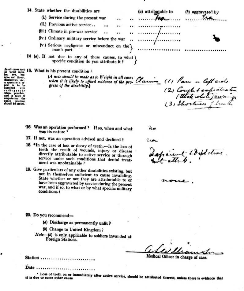 ‘Please see notes on Med.Hist. sheet. Bronchitis and pneumonia in Sept. 1916. States he contracted coughs and gets short of breath on slight exertion. I can find no physical signs of any kind at present moment. Heart normal. General health seems good.’