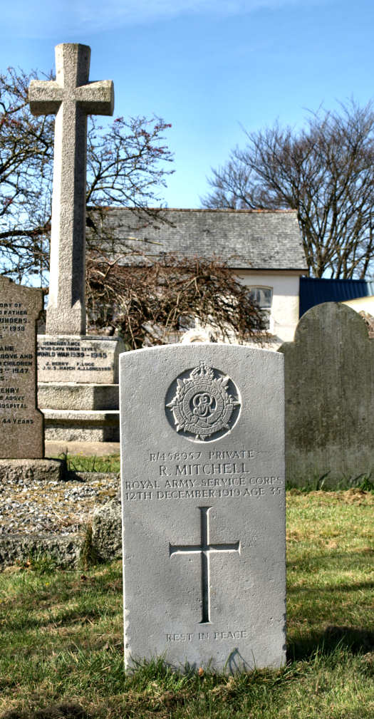 Richard Mitchell is the second of our Winkleigh heroes whose name was omitted from the Memorial Cross. He died in Winkleigh, the son of the Sexton, described also as a road-contractor and farmer, who might well have been responsible for digging his son’s grave in the churchyard which is situated as near as possible to our memorial. This branch of the Mitchells in Winkleigh was long established in the village, traced back to a John Mitchell born in 1827, a labourer, and his wife Mary born in 1821. They had three children, the eldest of whom, William was born about the year 1853. In 1876 William married Elizabeth Ellen Jones, born in 1849 in Coldridge. By 1881 the family was living with William’s younger brother Samuel (a Thatcher) at Herdwick, Winkleigh. Ten years later the census records William and Elizabeth in Lower Town, and in 1901 in Mount Pleasant (Dial Street). They had five children: John, born 1878, William, born 1880, Mary Ann, born 1883, Richard born 1884 and Emily, born 1887.